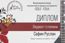 Поздравляем Сафина Руслана и его преподавателя Бахтиярову Эльмиру Анасовну с победой на Международном конкурсе исполнителей на народных инструментах "SOLO - FOLK" в г.Казань.