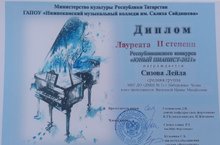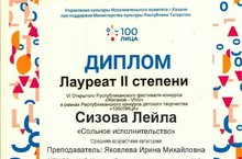 Поздравляем Сизову Лейлу с успешным участием в VI Открытом Республиканском фестивале-конкурсе "Жиганов - Vivo" в г.Казань.