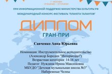 Поздравляем Савченко Анну (преподаватель Нуждина И.М.) с безоговорочной победой на Международном конкурсе-фестивале "Планета талантов" в г.Москва. Анна стала обладателем Гран- При конкурса. Умница! Желаем новых творческих побед!