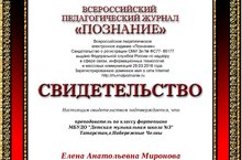 Елена Анатольевна Миронова поделилась своим педагогическим опытом на Всероссийском уровне, опубликовав свою статью "Творческие аспекты как основные факторы мотивации в ДМШ и ДШИ" на страницах Всероссийского педагогического журнала "Познание".