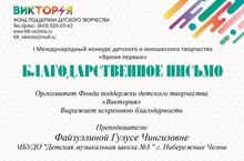 Поздравляем учащихся Файзуллиной Гулусы Чингизовны с успешным участием в I Международном конкурсе детского и юношеского творчества "Время первых" в г.Казань.
