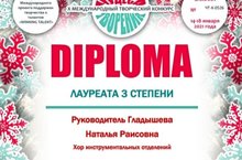 Поздравляем руководитнля хора Гладышеву Наталью Раисовну, концертмейстера Новосёлову Анну Евгеньевну с успешным участием Хора инструментальных отделений в X Международном творческом конкурсе "Чудеса творения" в г.Самара. Молодцы!