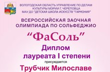 Поздравляем Ахметову Лилию Расулевну и её воспитанников с успешным участием во Всероссийской заочной олимпиаде по сольфеджио "ФаСоль" в г.Череповец.