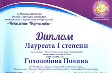 Поздравляем Гололобову Полину с успешным участием в VI Международном онлайн-конкурсе детского,юношеского и взрослого творчества "Поколение Творчества".