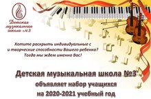 Детская музыкальная школа № 3 объявляетнабор учащихсяна новый 2020-2021 учебный год.тел. учебной части - (8552) 54-79-62Прием документов: с 25 апреля по 31 мая.Консультации: 1,2 июня в 18.00Приемные испытания: 3 июня в 17.00В связи со сложившейся обстановкой, сроки могут меняться.Следите за информацией.