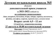 Детская музыкальная школа №5 объявляет дополнительный прием учащихся на 2021-2022 учебный год 23.08.2021
