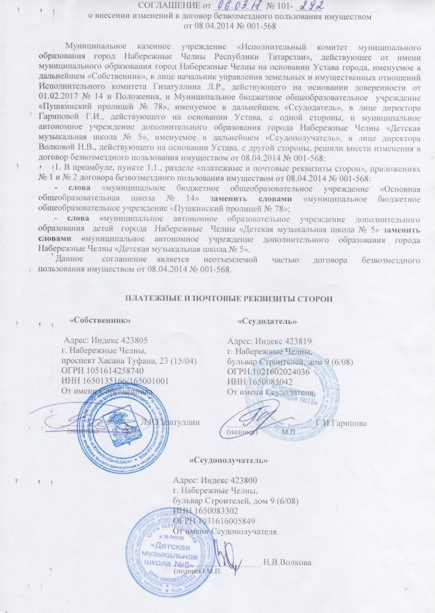 Договор безвозмездного пользования имуществом 001-568 от 08.04.2014