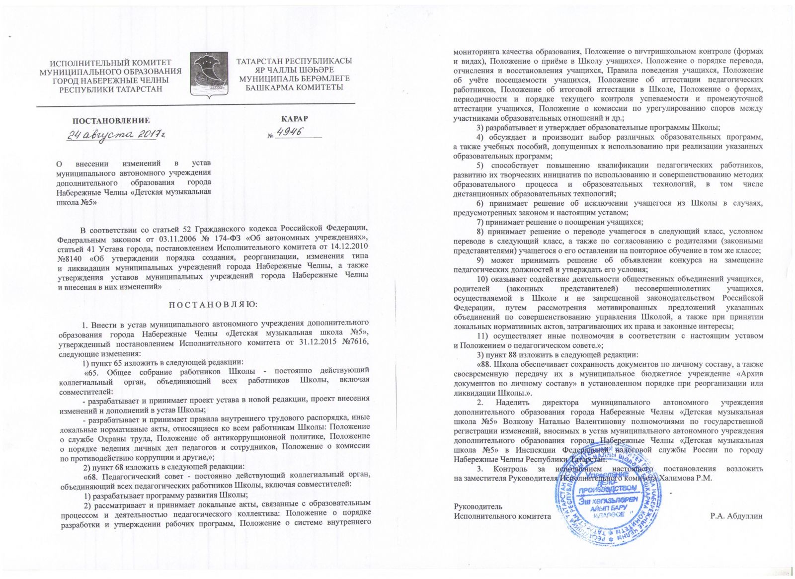 Постановление о внесении изменений в устав от 24.08.2017 г. № 4946