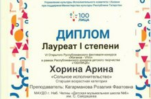 Поздравляем Хорину Арину с победой в VI Открытом Республиканском фестивале-конкурсе «Жиганов-Vivo»! Класс преподавателя Кагармановой Р.Ф. -