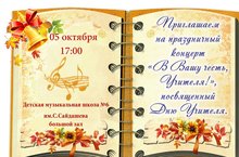 Уважаемые преподаватели, учащиеся и родители! Приглашаем вас завтра, 5 октября, в 17.00 на праздничный концерт "В ВАШУ ЧЕСТЬ,УЧИТЕЛЯ!", посвященный Дню учителя.
