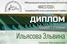 Ильясова Эльвина - лауреат II Международный конкурс фортепианного искусства "MAESTOSO", посвященный 150-летию со дня рождения А.Скрябина!