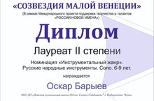 Барыев Оскар - лауреат II Международного конкурса-фестиваля детского, юношеского и взрослого творчества "Созвездия малой Венеции"!