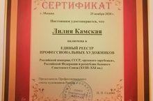 Поздравляем Камскую Лилию Раиповну с вступлением в профессиональный союз художников России и включением в единый реестр профессиональных художников Российской Империи, СССР, Русского зарубежья, РФ и республик бывшего Советского союза (XVIII-XXIв.в)