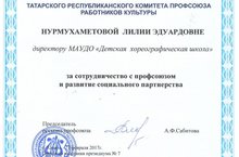 Благодарность Татарского Республиканского комитета профсоюза работников культуры Нурмухаметовой Лилие Эдуардовне за сотрудничество с профсоюзом и развитие социального партнерства