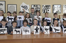 27.05.2014г На фоне выставке "Черное и белое" в городской Библиотеке им.Мусы Джалиля прошел мастер класс для учеников СОШ №10. Проводил преподаватель «ДХШ №1» Евграфова Игорь Петрович он познакомил учеников с «Разработкой каллиграммы ».