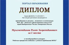 Коллектив Детской художественной школы №1 поздравляет преподавателя высшей квалификационной категории, члена Союза художников РТ Мухаметдинова Риата Загретдиновича с Победой в Международном конкурсе «Рабочая программа педагога с учетом требований ФГОС». 13.05.2017