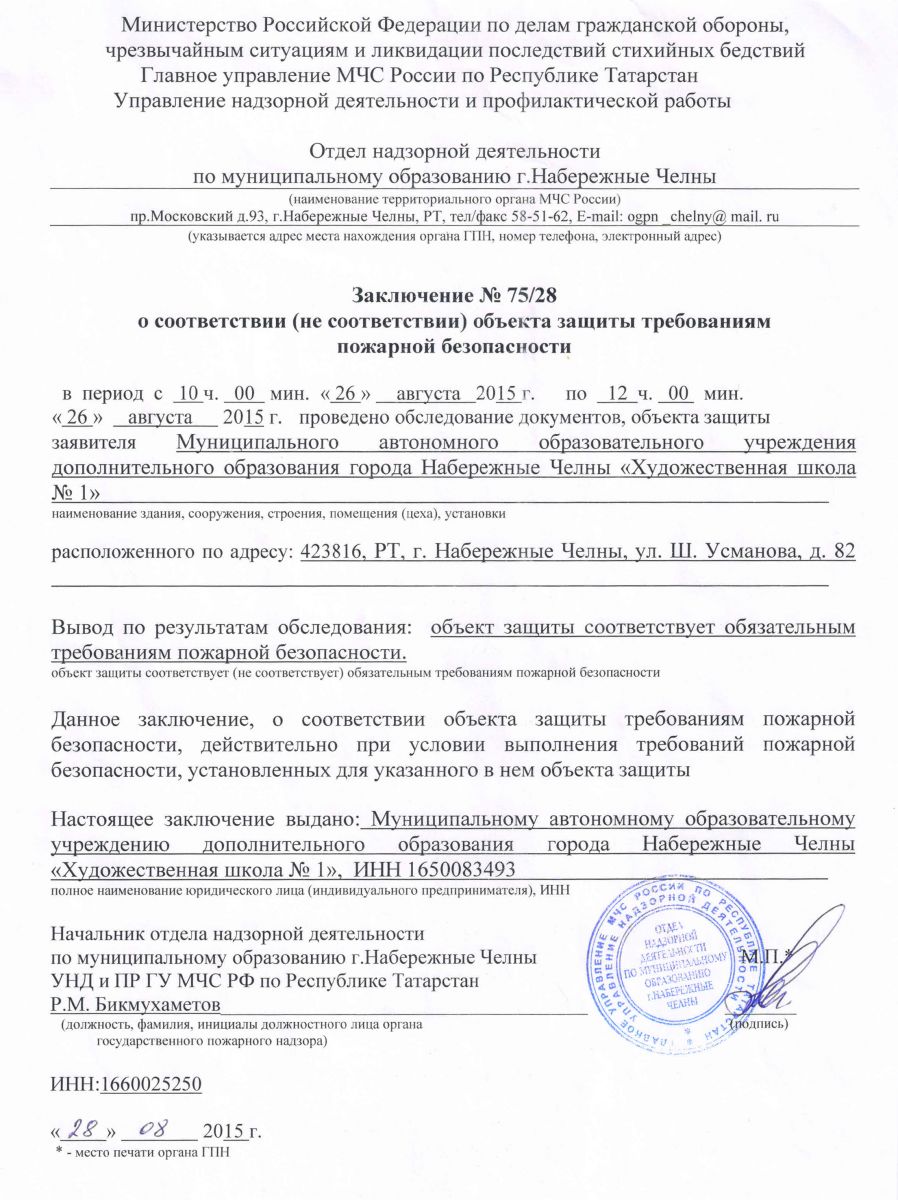 Заключение о соответствии требованиям пожарной безопасности Детской художественной школы №1
