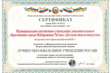 Детская школа искусств получила официальный наградной знак «Лучшее образовательное учреждение России», что подтверждено сертификатом Международной Академии общественного признания.