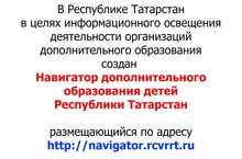 В Республике Татарстан в целях информационного освещения деятельности организаций дополнительного образования создан Навигатор дополнительного образования детей Республики Татарстан.