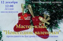 Детская школа искусств приглашает на мастер-класс "Новогодние валеночки". Для работы с собой необходимо принести шерсть для валяния. -