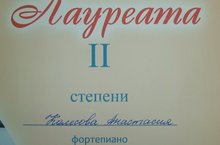 14 - 20 декабря 2015 года в г. Казань состоялась Международная Олимпиада Детского Исполнительского Искусства "Sforzando".Колесова Анастасия по классу спец. фортепиано удостоена звания Лауреата II степени.