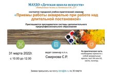 В школе прошел учебно-практический семинар заведующего художественным отделением, к.п.н. Смирновой Светланы Раисовны на тему «Приемы работы акварелью при выполнении длительной постановки». Участниками семинара были рассмотрены и обсуждены учебные задачи выполнения обучающимися длительной постановки с натуры и проблемы, с которыми сталкиваются ученики в процессе работы.
