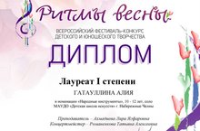 Учащаяся музыкального отделения нашей школы Гатауллина Алия приняла участие во Всероссийском фестивале-конкурсе детского и юношеского творчества "Ритмы весны".