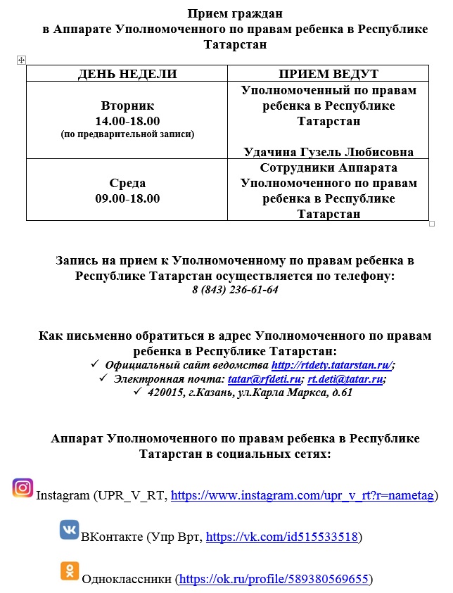 Опубликовано: 04.07.2019Обновленная контактная информация о деятельности в сфере защиты прав детей, руководствуясь Законом Республики Татарстан от 1 августа 2011 года No59-ЗРТ «Об Уполномоченном по правам ребенка в Республике Татарстан»