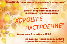Детская школа театрального искусстваприглашает6 октября в 17:00людей старшего поколенияна концертную программу"Хорошее настроение"Ждём всех по адресу: Новый город, д.18/08(здание бывшего детского сада)