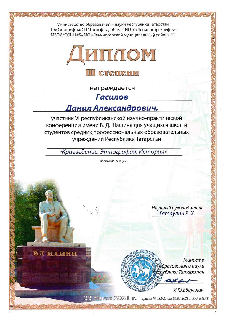 (гр. ИС-9-5) и его научного руководителя Гатаулина Рената Хайруллаевича с успешным выступлением на VI республиканской научно-практической конференции имени В.Д. Шашина для учащихся школ и студентов средних профессиональных образовательных учреждений Республики Татарстан в номинации "Краеведение. Этнография. История".