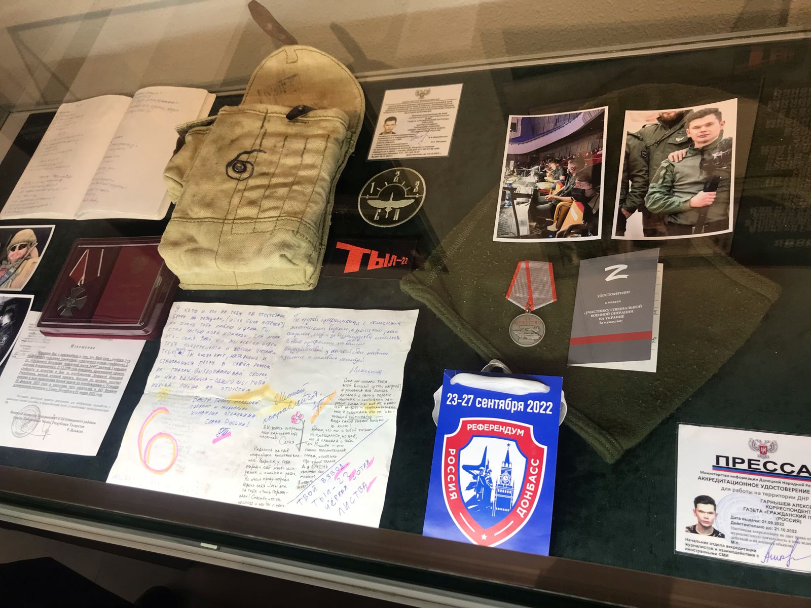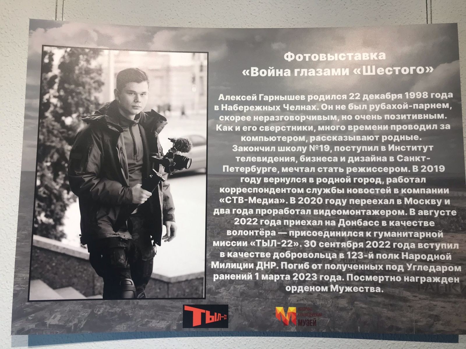 На выставке был представлен цикл работ челнинского фотографа, видеооператора, волонтера, бойца Народной милиции ДНР, кавалера ордена Мужества Алексея Гарнышева - «Война глазами «Шестого», погибшего в зоне спецоперации.