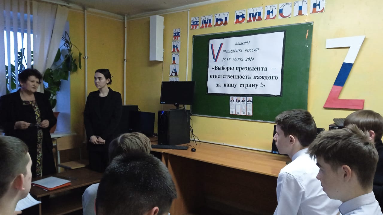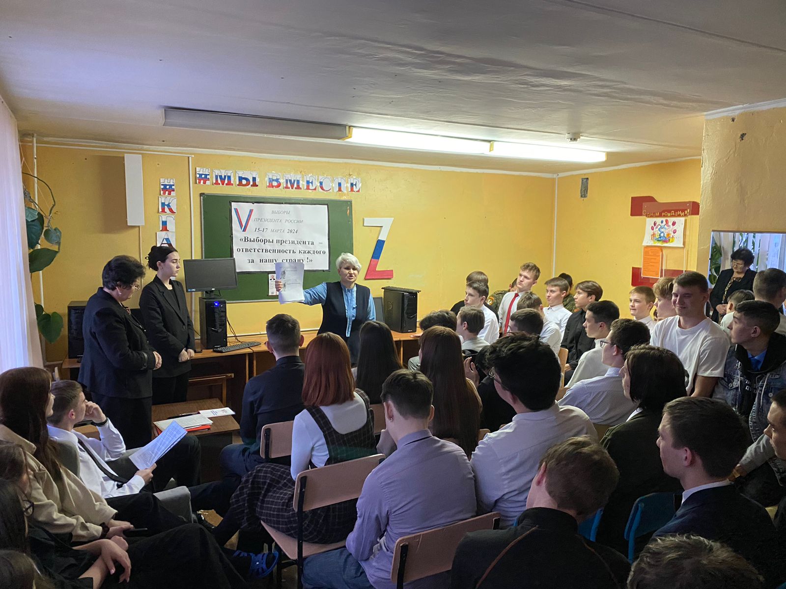 Помимо этого, заместитель директора по воспитательной работе - Шуленкова Марина Александровна провела интеллектуальную викторину "Я иду на выборы Президента РФ", в которой активно участвовала аудитория.
