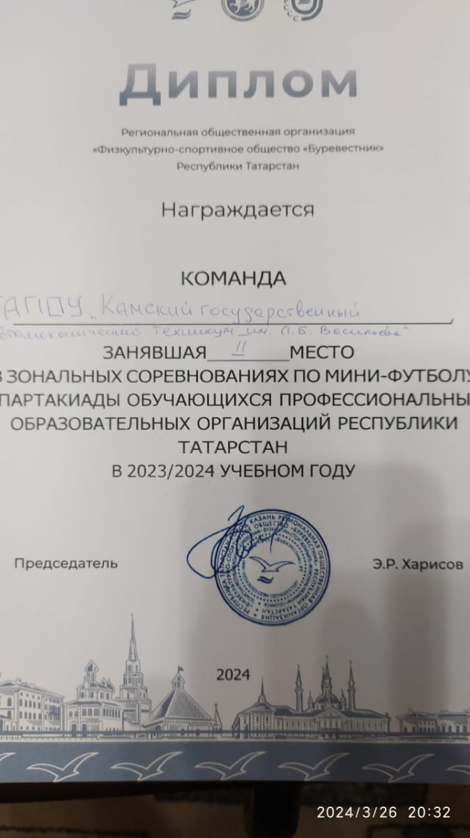 Поздравляем команду Камского государственного автомеханического техникума с отличным результатом и благодарим тренера Цветкова Дмитрия Николаевича за его труд и поддержку! Эта победа - заслуженный результат вашего труда и упорства.