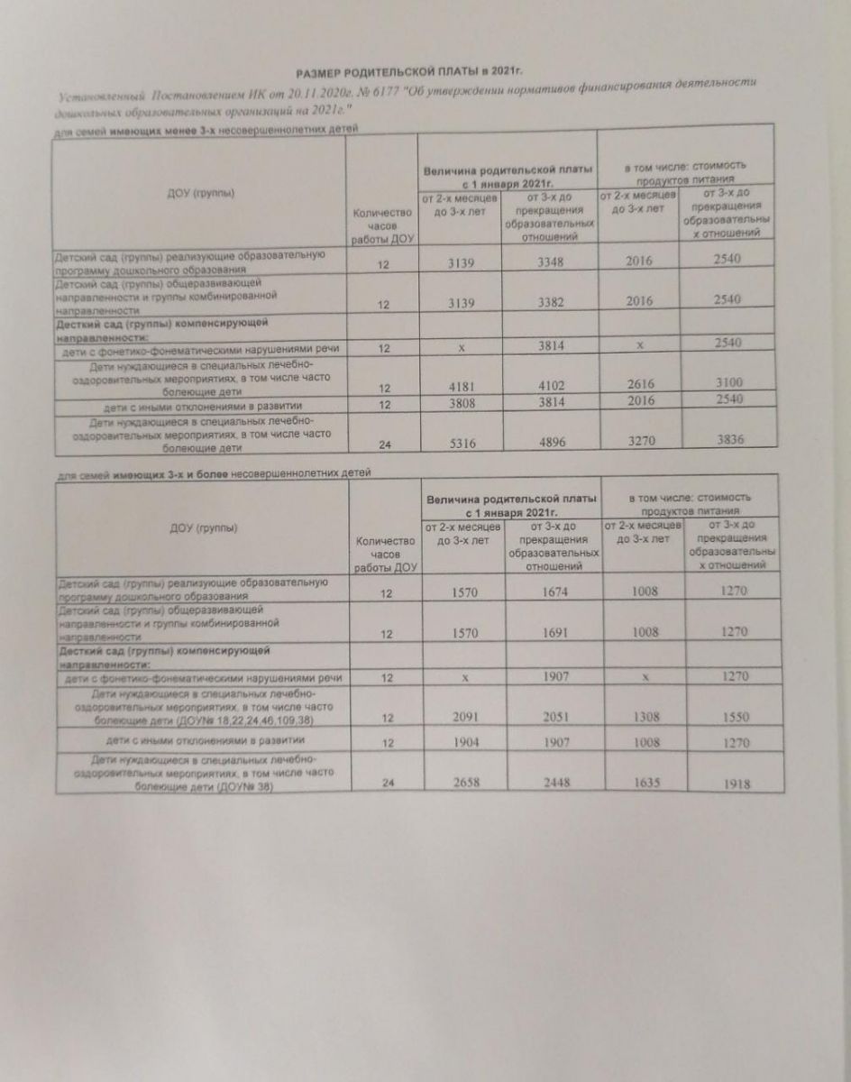 По постановлению от 20.11.2020г. № 6177 «Об утверждении нормативов финансирования деятельности дошкольных образовательных организаций г. Набережные Челны на 2021 год», с 01.01.2021 года изменится размер родительской платы.
