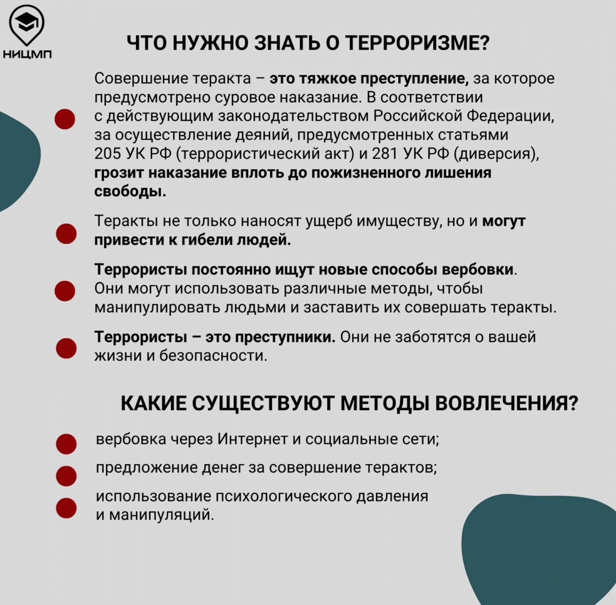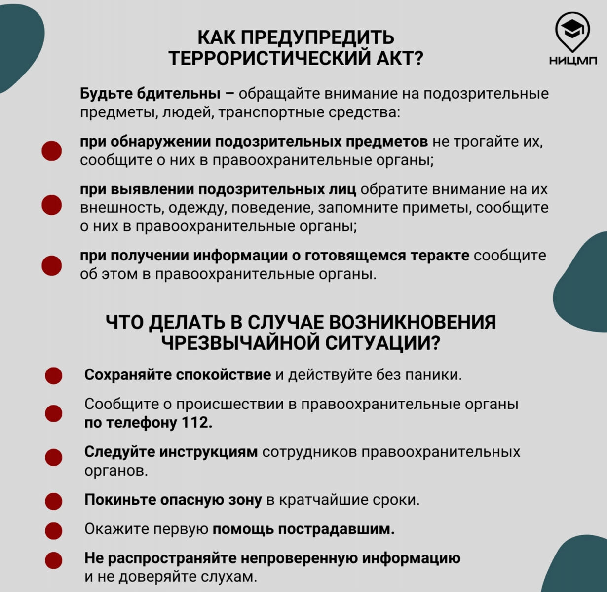Для повышения осведомленности граждан о ключевых правилах безопасного поведения в случаях террористических угроз специалисты НИЦ Мониторинга и профилактики разработали информационные карточки с пошаговыми алгоритмами и четкими инструкциями о том: