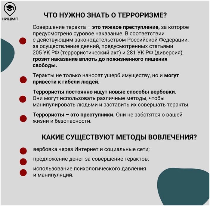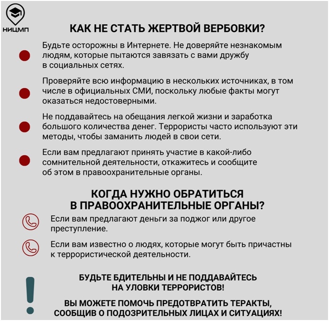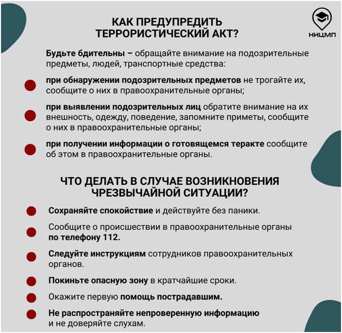 Для повышения осведомленности граждан о ключевых правилах безопасного поведения в случаях террористических угроз специалисты НИЦ Мониторинга и профилактики разработали информационные карточки с пошаговыми алгоритмами и четкими инструкциями о том: