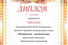 Честь нашего детского сада защищал Тян Егор, лауреат Международного конкурса юных исполнителей «Илһамият», Республиканских фестиваль-конкурсов «Первые шаги», «Культурное наследие моего народа» (руководитель - воспитатель по обучению детей родному языку Хасанова Р. М.) Он выразительно прочитал перевод стихотворения татарского поэта Роберта Миннуллина «Приезжайте в гости». Желаем нашему Егору не останавливаться на достигнутом, достичь новых творческих успехов! -