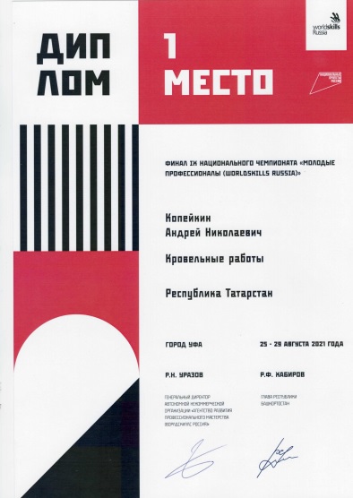 В этом чемпионате студенты ГАПОУ «Камский строительный колледж имени Е.Н. Батенчука» Онищук Артём и Копейкин Андрей заняли первое место по компетенции «Кровельные работы», тем самым привнесли ещё одно золото в копилку нашего колледжа.