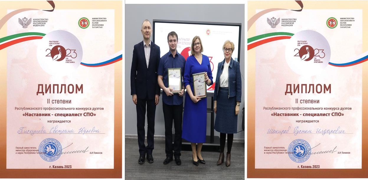 По итогам всех конкурсных заданий наши преподаватели Пискунова Светлана Юрьевна, которая представляла в дуэте роль наставника, и Шакиров Рустем Илдарович, который был в роли специалиста СПО, стали призерами и заняли почетное 2 место.
