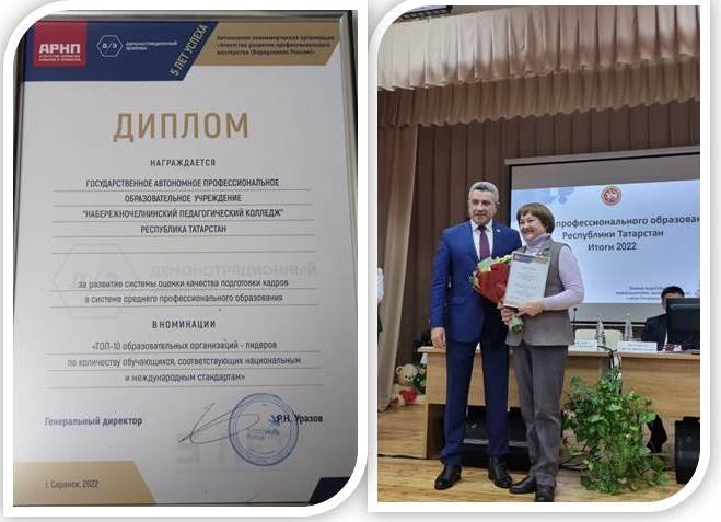 По итогам внедрения и проведения демонстрационных экзаменов, за развитие системы оценки качества подготовки выпускников директору ГАПОУ «Набережночелнинский педагогический колледж» Альфие Тимербаевне Галиевой от имени руководства Агентства развития навыков и профессий был вручен диплом в номинации «ТОП-10 образовательных организаций – лидеров по количеству обучающихся, соответствующих национальным и международным стандартам».
