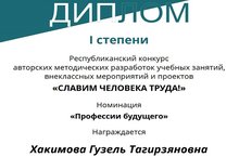 Поздравляем Хакимову Гузель Тагирзяновну с победой в Республиканском конкурсе авторских методических разработок учебных занятий, внеклассных мероприятий и проектов «СЛАВИМ ЧЕЛОВЕКА ТРУДА!»