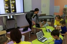 Занятия проходят в игровой форме с использованием новейшего интерактивного оборудования: Smart доска и стол, интерактивные кубы и песочница, мобильный планетарий.