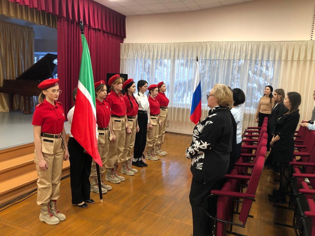 Наши студенты отряда Юнармия прошествовали с флагами Российской Федерации и Республики Татарстана. А после были исполнены гимны Российской Федерации и Республики Татарстан.