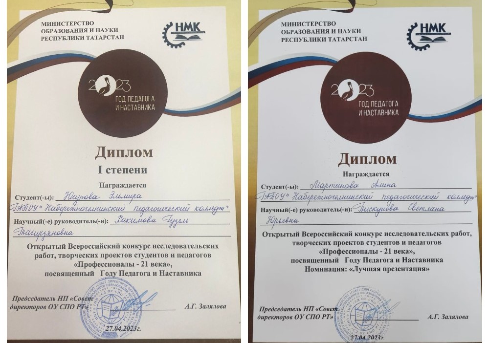 27.04.23 на базе ГАПОУ «Нижнекамский многопрофильный колледж» прошел открытый всероссийский конкурс исследовательских работ, творческих проектов студентов и педагогов «Профессионалы-21 века», приуроченный Году педагога и наставника.