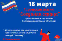 18 марта в Российской Федерации отмечается День воссоединения Крыма с Россией. В рамках праздничных мероприятий в этот день детская общественная организация «Городской совет учащихся» проводит городскую акцию «Соединяя сердца». Участникам акции необходимо исполнить вальс под музыкальную композицию «Севастопольский вальс» либо станцевать «Калинку», записать видео исполнения и выложить ролик в социальную сеть Вконтакте с #ТанецГСУ.