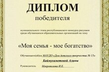 Поздравляем педагога Мокрополову И.Е. и учащуюся Баймухаметову Алину с победой в муниципальном этапе республиканского конкурса рисунков "Моя семья - моё богатство".
