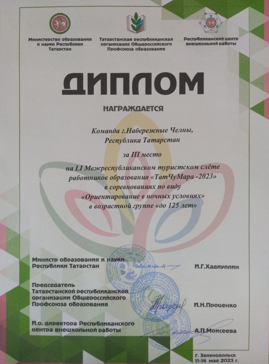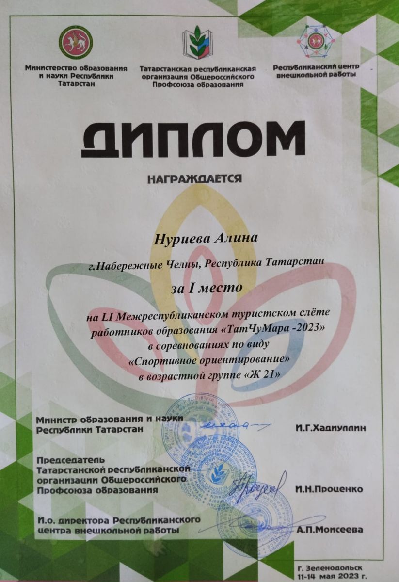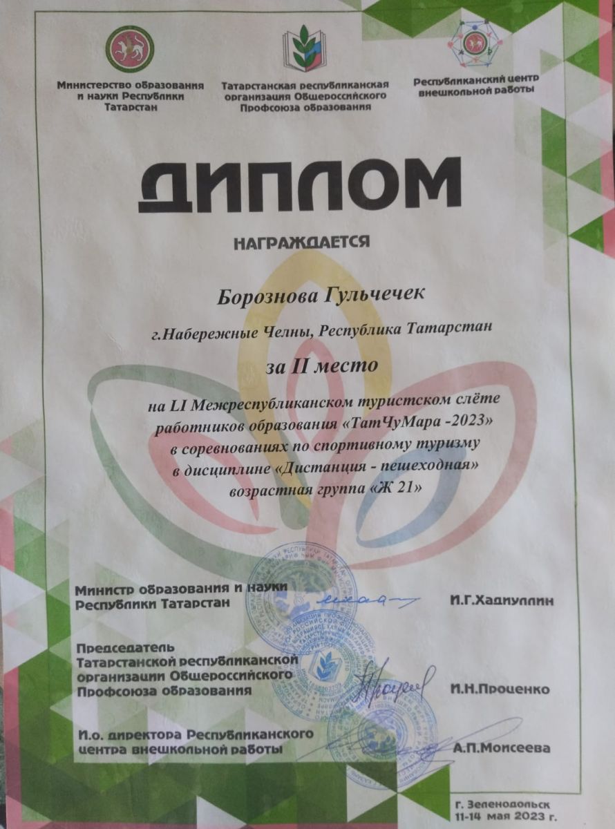 Нуриева А. А.. - 1 место, Борознова Г. А. - 2 место, Команда - 3 место, Команда - 2 место на LI Межреспубликанском туристском слете работников образования "ТатЧуМара - 2023" в соревнованиях по виду "Спортивное ориентирование" в возрастной группе "Ж21" (11-14.05.2023 г.)