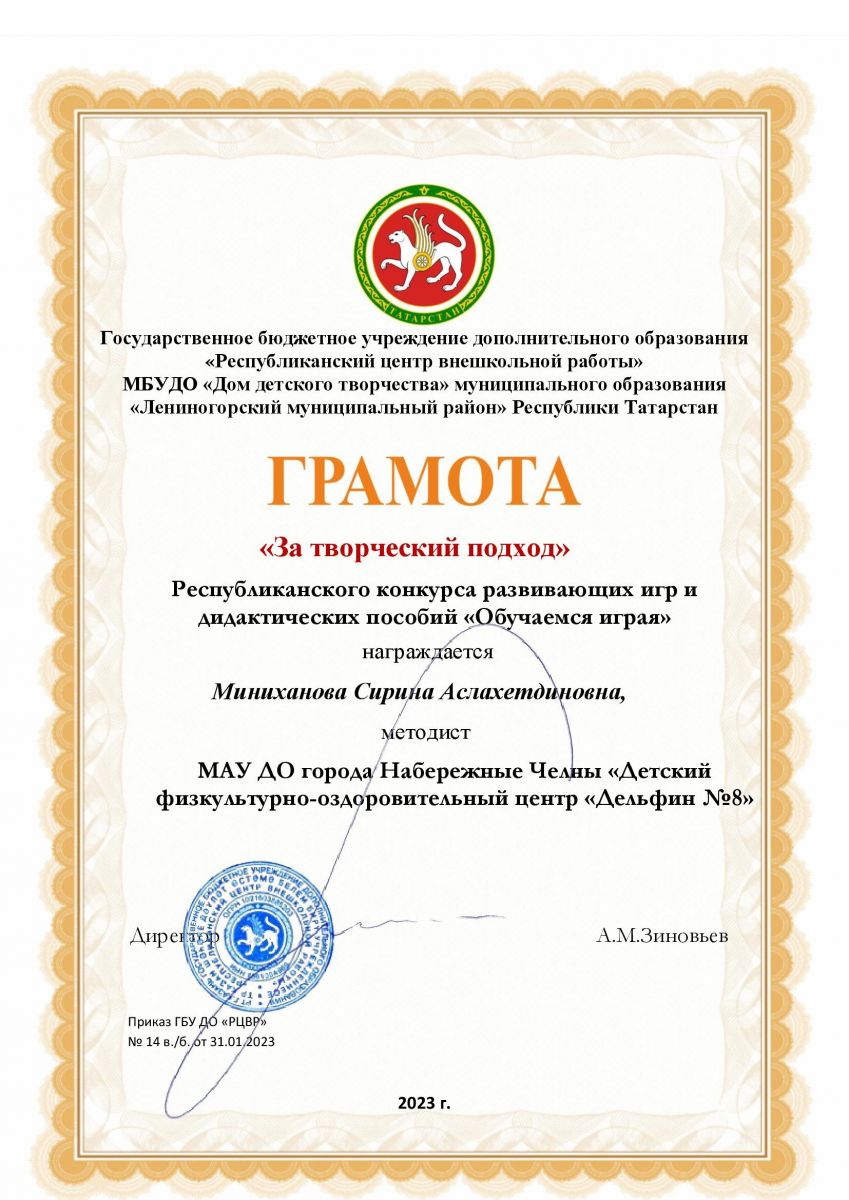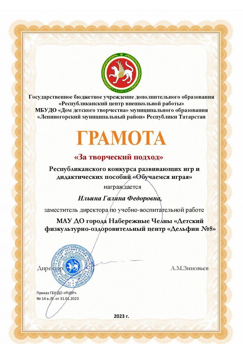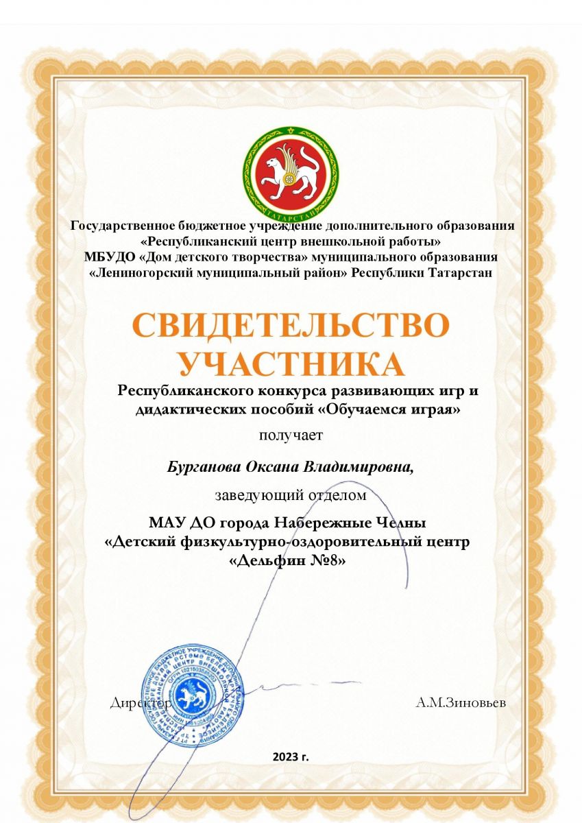 Бурганова О. В. - участник, Ильина Г. Ф. - "Творческий подход", Миниханова С.А. - "Творческий подход" в Республиканском конкурсе развивающих игр и дидактитческих пособий "Обучаемся играя" (31.01.2023)