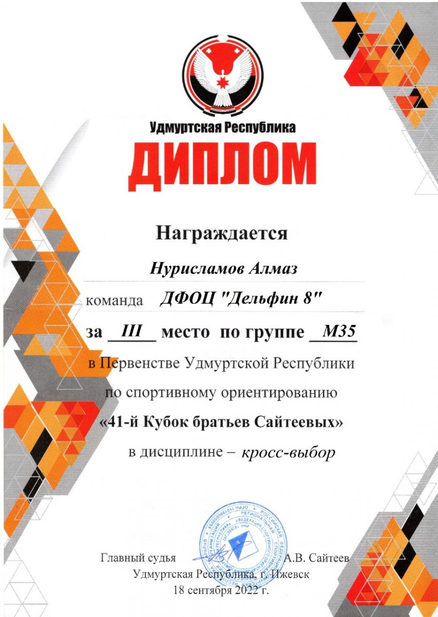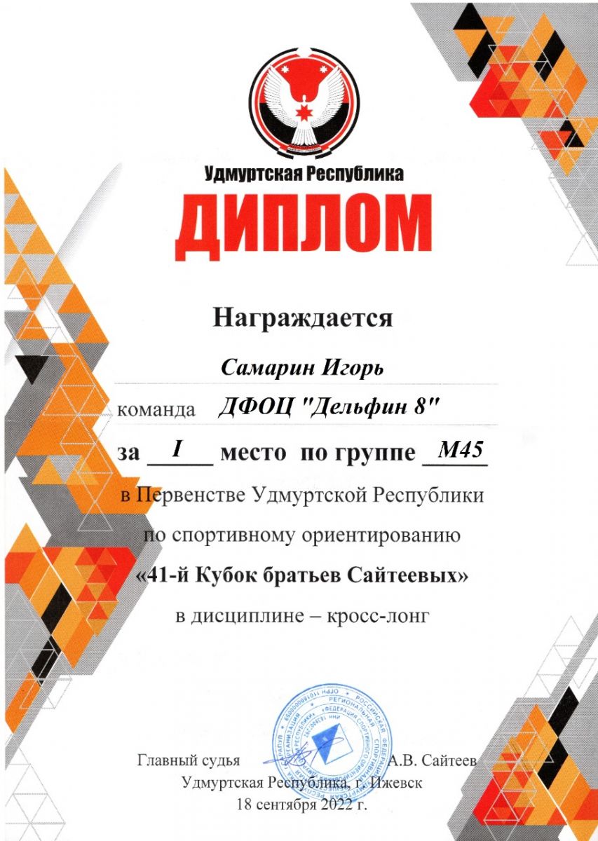 Нурисламов А.Д. - 3 место, Самарин И.В. - 1 место в Чемпионате и Первенстве Удмуртской Республики по спортивному ориентированию (18.09.2022 г.)