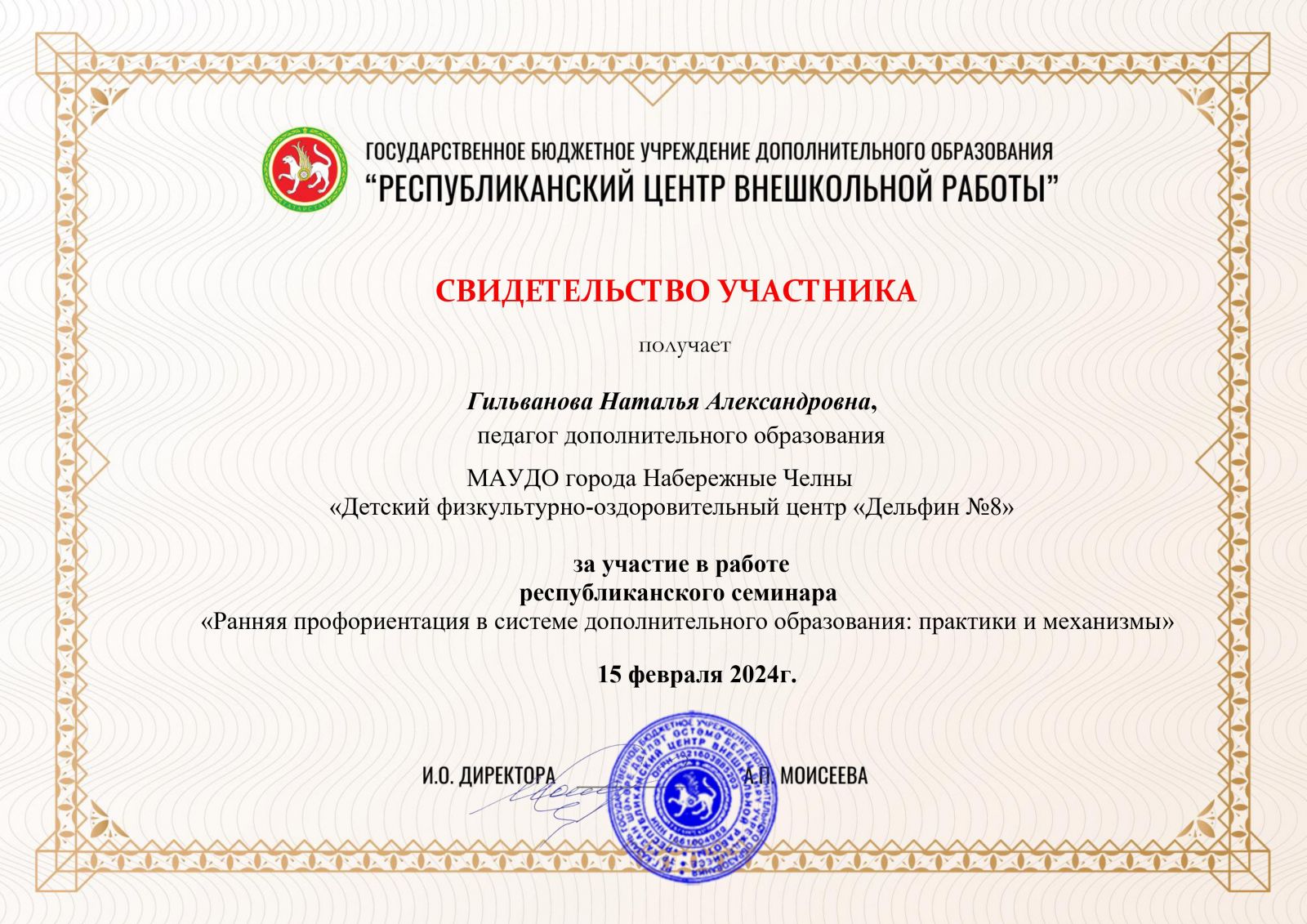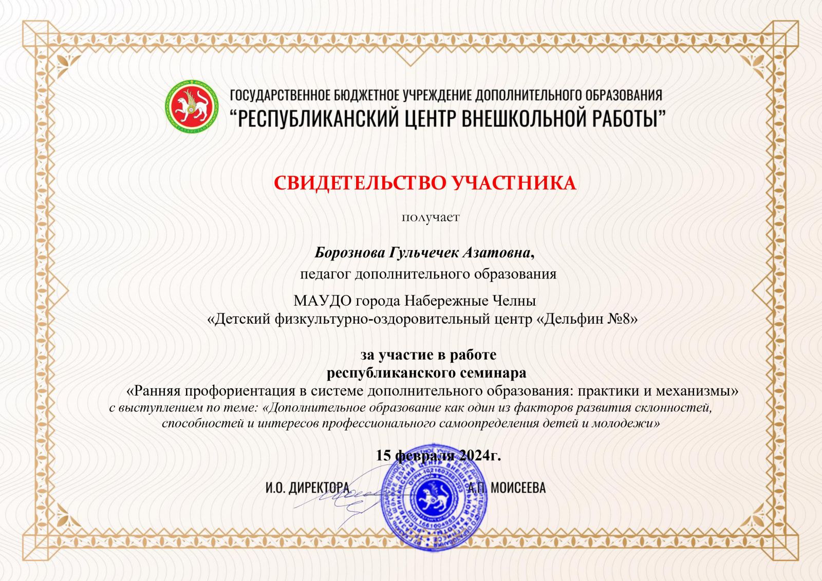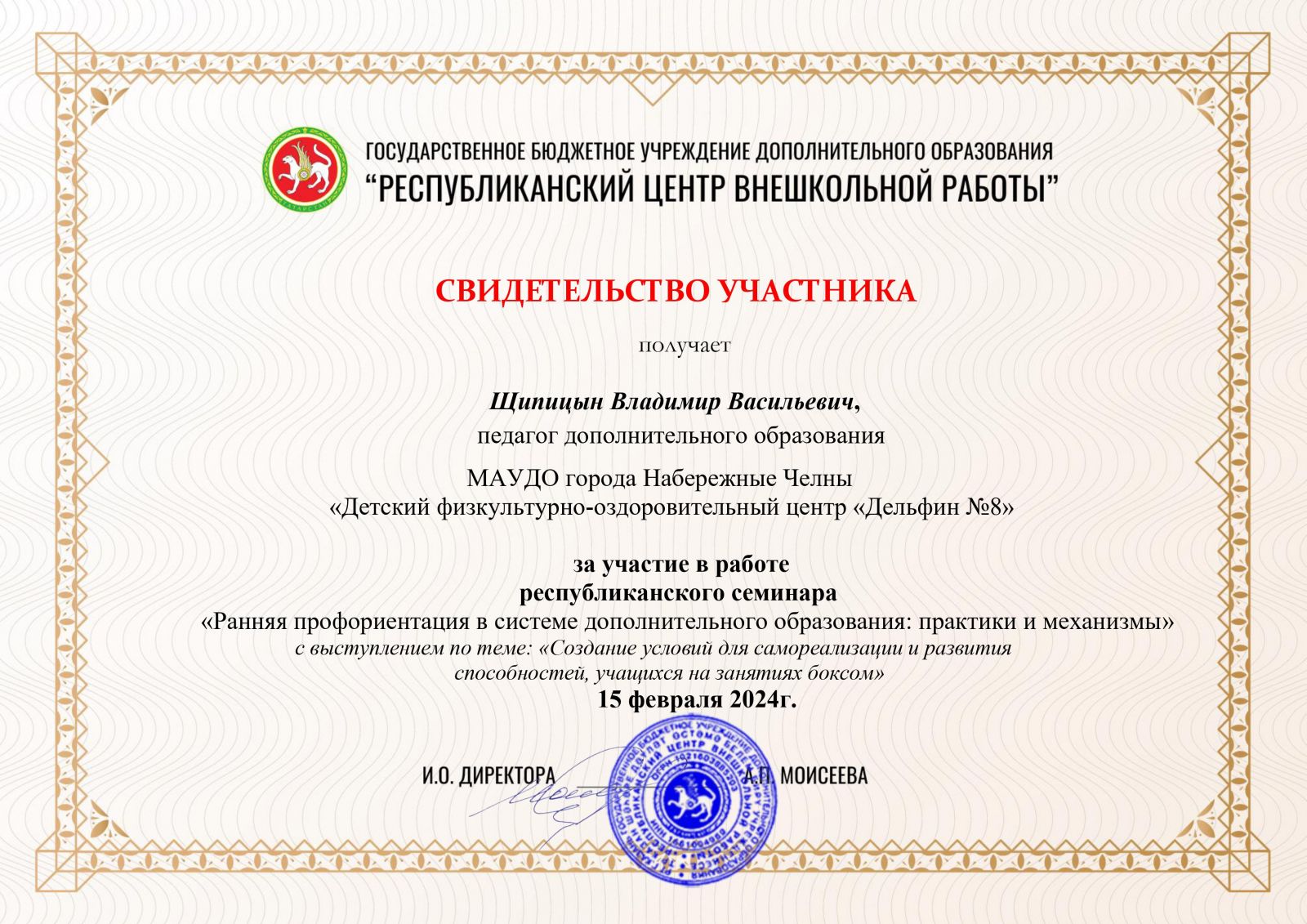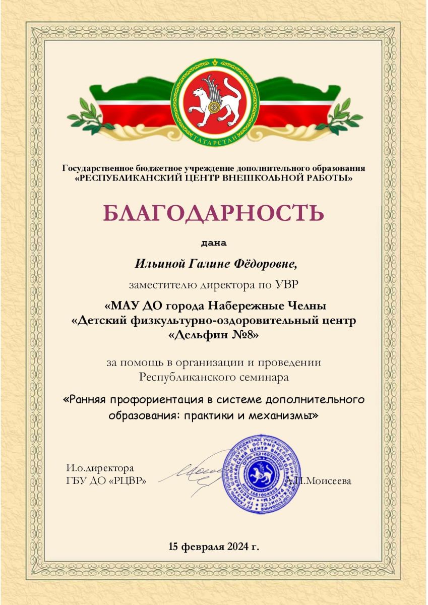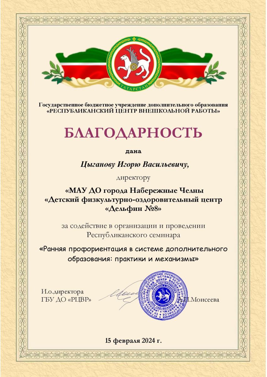 - Благодарность Цыганову И.В., Благодарность Ильиной Г.Ф., Арзамасцева Р.В., Борознова Г.А., Валинуров Р,Р., Гильванова Н.А., Костенко Ю.В., Миниханова С.А., Нурисламов А.Д., Сабирова Л.М., Щипицын В.В., Юсупов Р.Р., Дубовая М.М., Ермолаева А.Д., Ильина Г.Ф., Миниханова С.А., Михейкина Н.Р., Таушев С.С., Цыганов И.В., Шапошников А.П., Щипицын С.В. приняли участие в работе Республиканского семинара "Ранняя профориентация в системе дополнительного образования: практики и механизмы" (15.02.24)